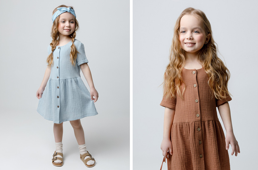 - Платья из муслина. Муслин — это натуральная ткань с воздушной текстурой, которая отлично пропускает воздух и впитывает влагу. В муслиновом платье ребенку не будет жарко даже в самый теплый день. Такие модели невероятно легкие и становятся только мягче после каждой стирки.
